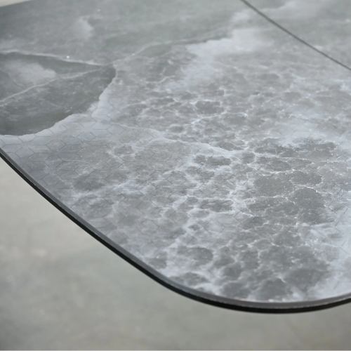 The aventador table offers elegance and versatility with two polished ceramic top options?Tempestas and silentium?Crafted from high-quality laminam, known for their durability and resistance to scratches and stains. This stylish table also features extendable leaves, accommodating larger gatherings effortlessly, while its black powder-coated steel base showcases an eye-catching origami-like folded design, blending modern aesthetics with functionality.