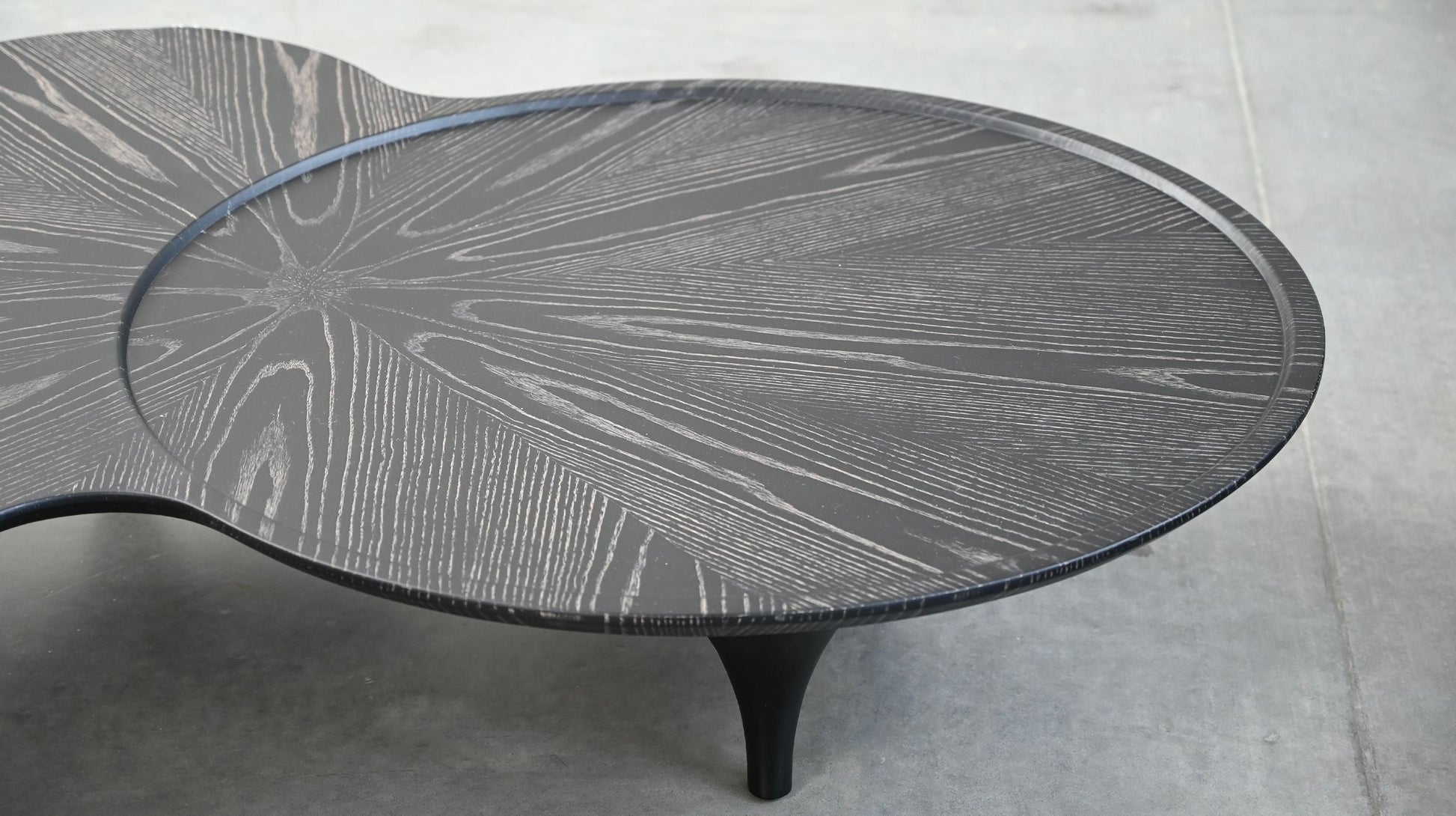 The coupe coffee table offers a striking blend of natural inspiration and modern design. Its unique tri-circular top is made from birch wood and has a sophisticated vintage black wash finish. Adding a touch of whimsy, the table's icicle-inspired leg detail brings an unexpected element of the outdoors into your living space, making it a captivating centerpiece. Practical and spacious for styling