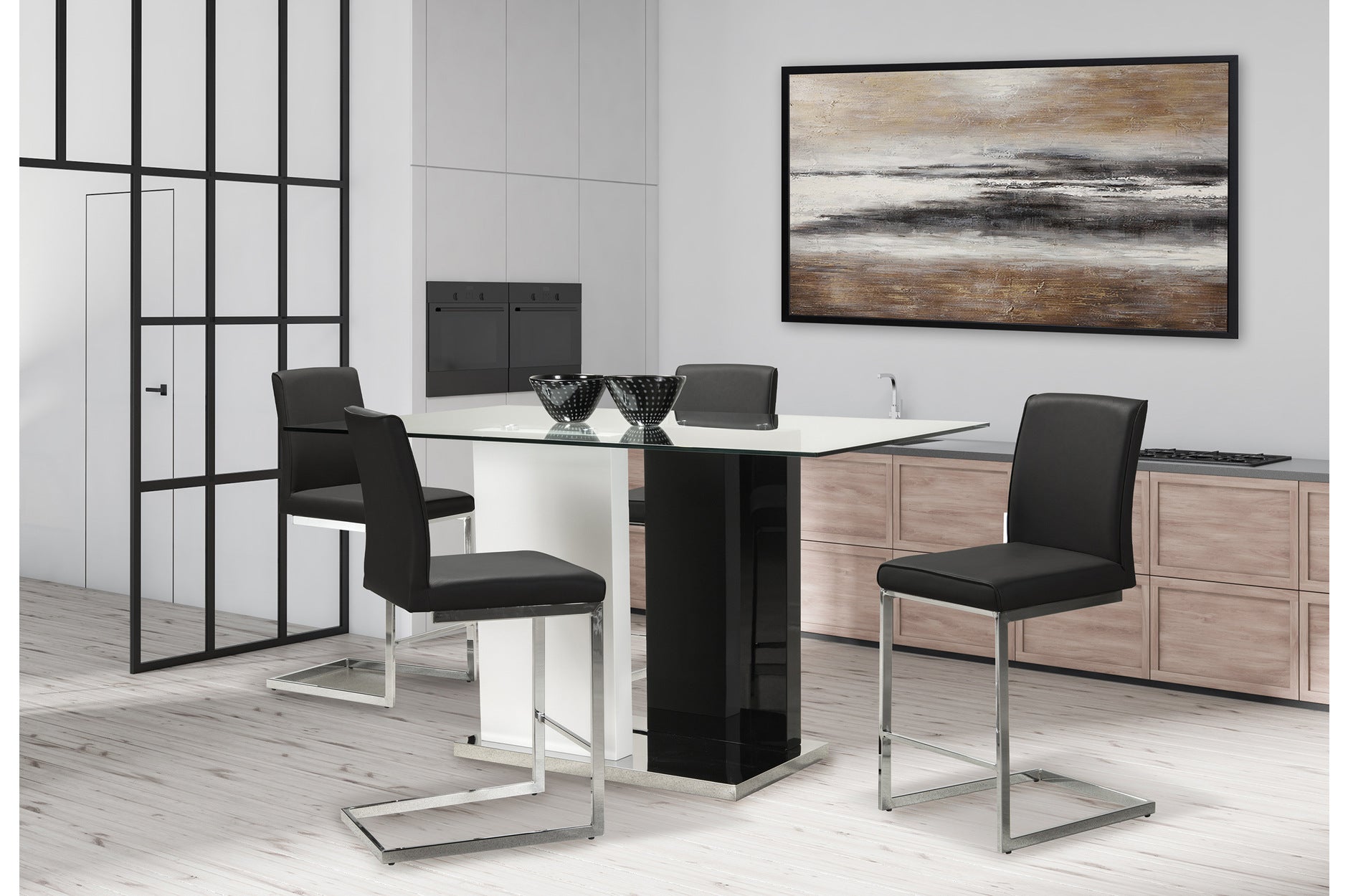 Bold colour contrast paired with geometric shapes give the Libra dining table a special architectural flair. Clear rectangular 12mm tempered glass floats over offset rectangular columns on a steel base, finished in glossy white and lustrous black for a chic two-tone effect. The table is partnered with suave contemporary side chairs in a faux leather and chrome finish in your pick of black, white, or grey upholstery - perfect to complete this ultra-modern look for your dining area. Counter-height design for elevated dining Rectangular 12mm tempered glass top Frame constructed from two offset rectangular columns of engineered wood lacquered in black and white Base made from engineered wood with a shiny stainless-steel finish Colour-blocking in black, white, metal, and glass creates a modern architectural look Contemporary bright glass and glossy finishes creates a bright and open dining area Metal and glass construction is easy to clean and maintain Assembly required This