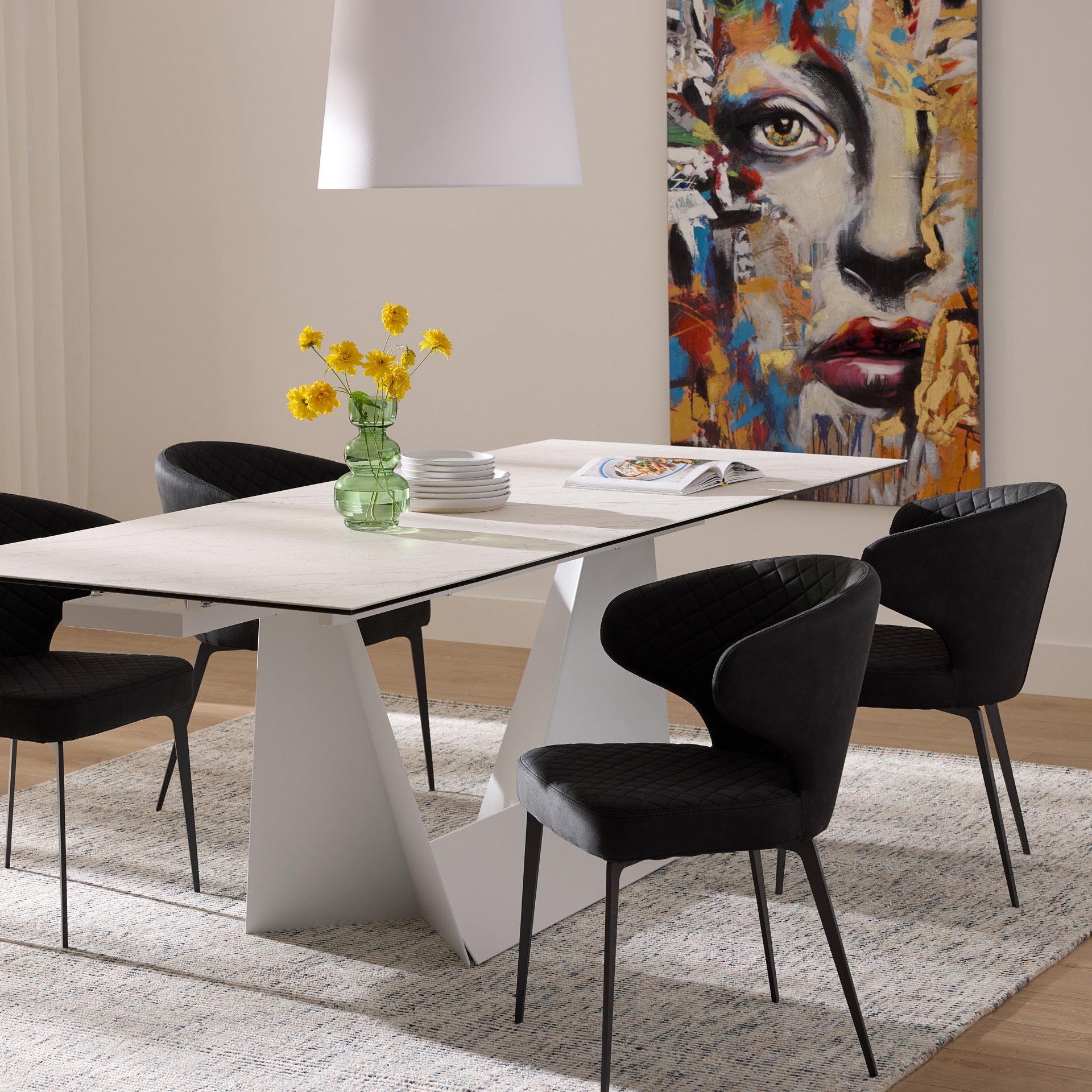 The origami dining table has two manual extending leafs that are self storing under the table. It is made with a white powder coated steel base and the top is made from ceramic and glass that is laminated together. The ceramic has a matte textured finish and looks like real carerra marble. The ceramic is scratch proof and stain proof and is easily maintained with soap and water.