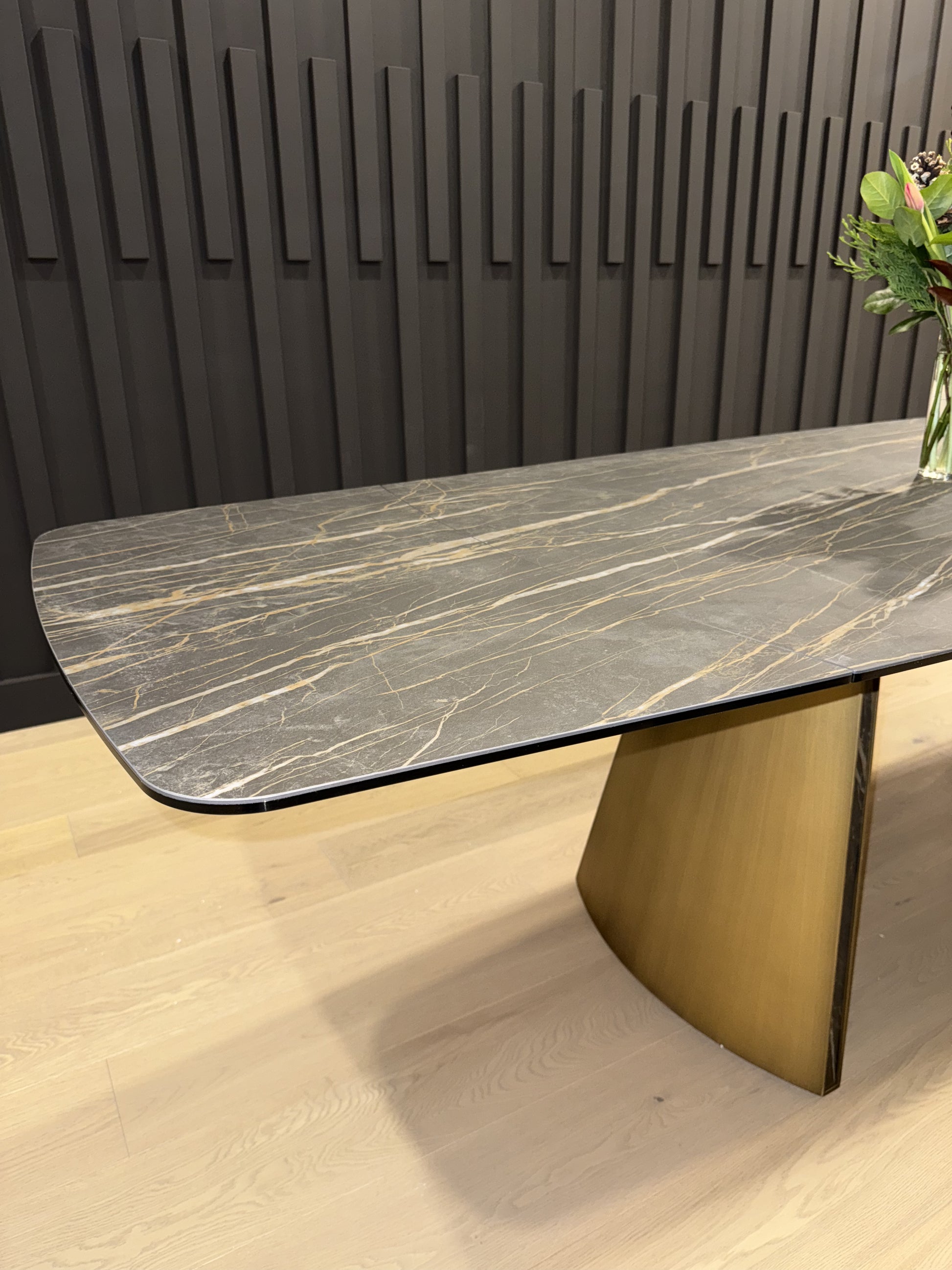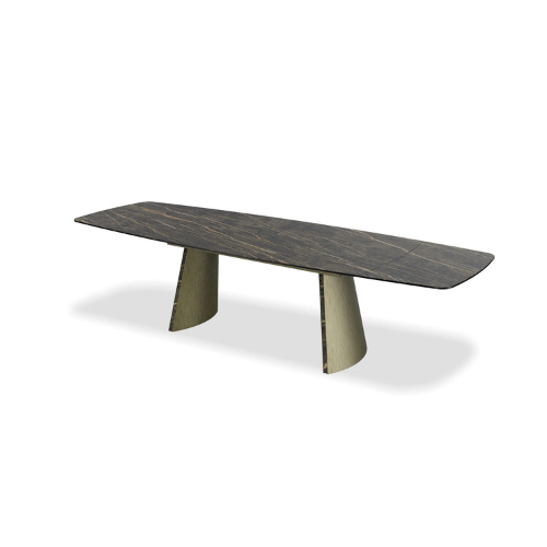 The ravello dining table showcases a stunning design with a brushed antique brass base, complemented by intricate noir desir ceramic inlay leg details that add a touch of elegance. Its tabletop is made from luxurious noir desir ceramic, available in both high gloss and matte finishes to suit various styles. Additionally, this table features extension leaves, making it a practical choice for accommodating guests and special occasions while maintaining its sophisticated appeal.